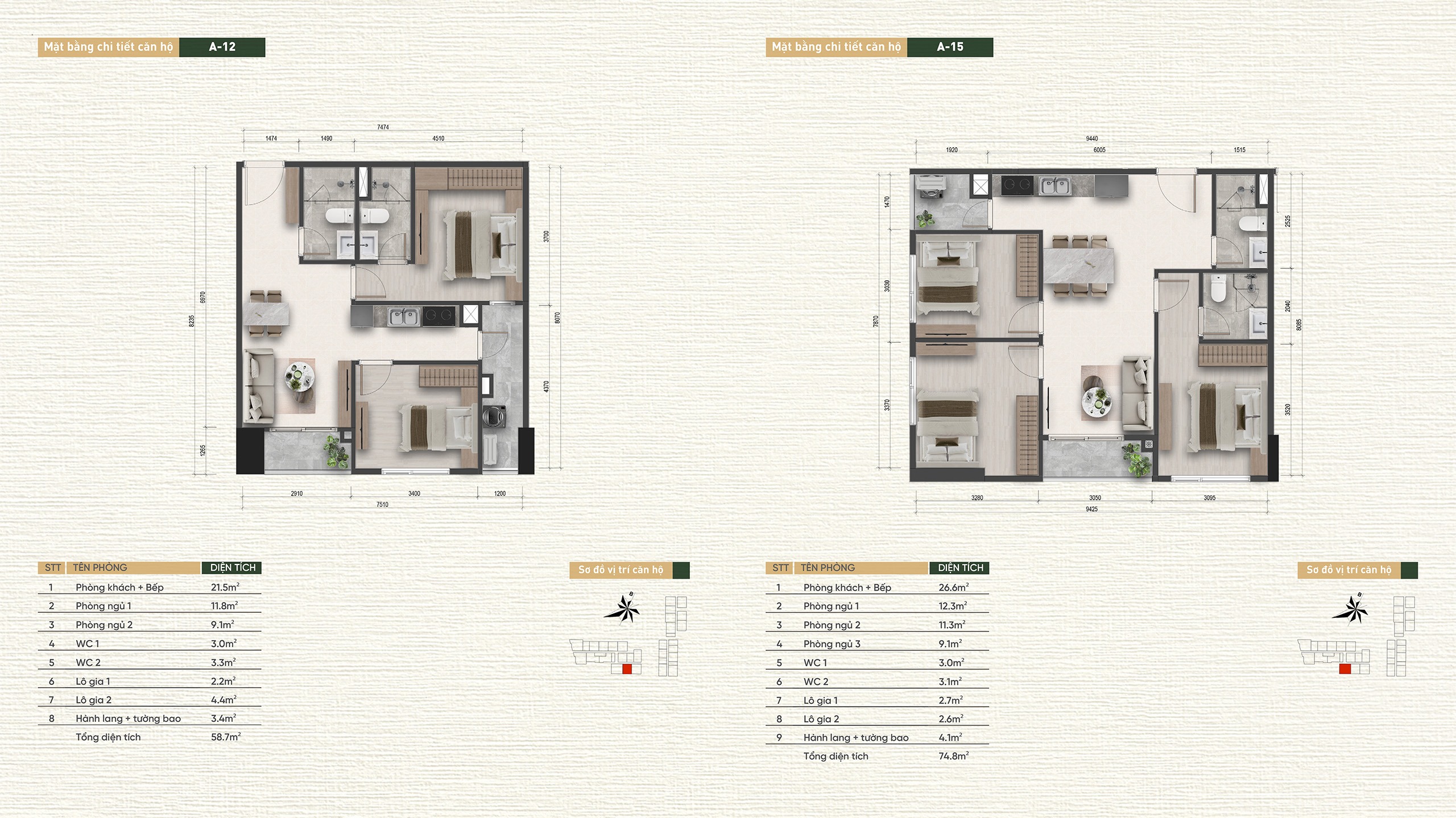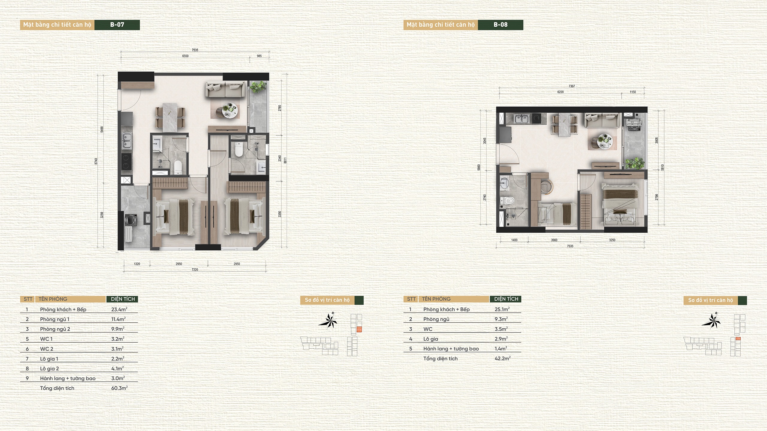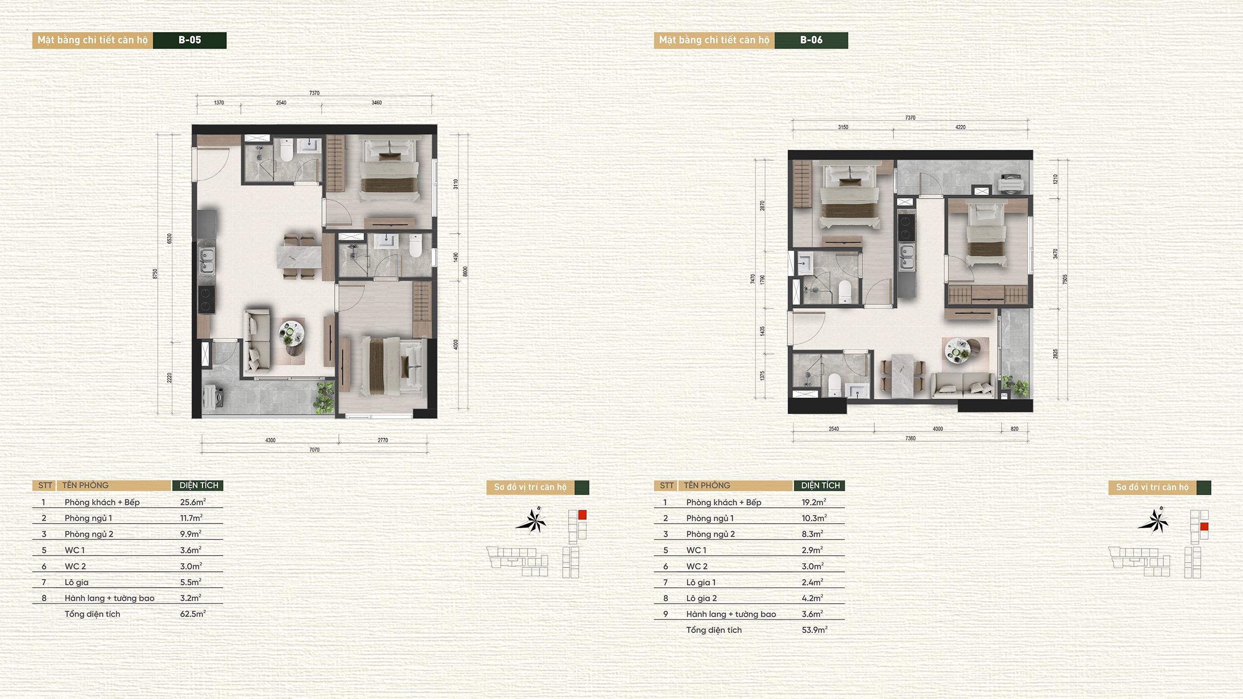 - Căn hộ 2 phòng ngủ – 2wc : 60m2 – 63,2m2 – 67m2