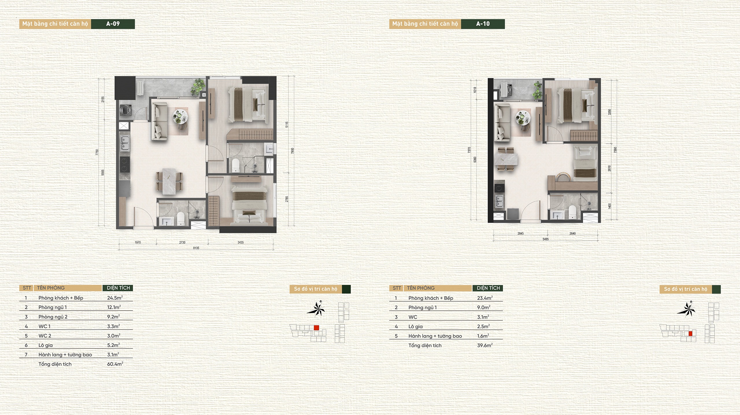 - Căn hộ 1 phòng ngủ + : 45,9m2 – 48,4 m2 – 50,4m2